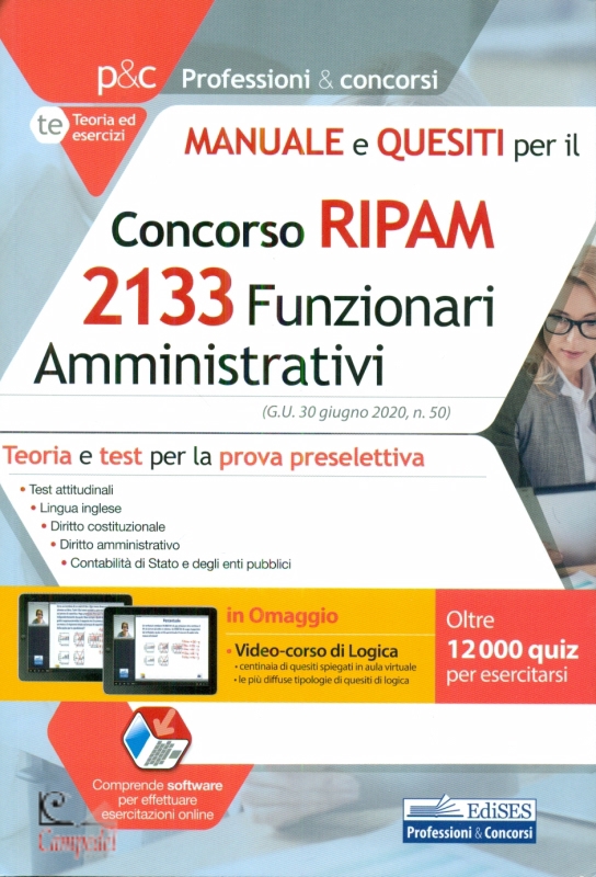 Manuale e quesiti per il concorso RIPAM 2133 funzionari amministrativi. Teoria e test per la prova preselettiva. Con aggiornamento online. Con software di simulazioni Editore: Edises professioni & concorsi Collana: Professioni & concorsi Data di Pubblicazione: luglio 2020 Il manuale è indirizzato a quanti intendono prepararsi alla prova preselettiva del concorso RIPAM per 2133 Funzionari amministrativi (bando in Gazzetta Ufficiale n. 50 del 30 giugno 2020) da destinare ai ruoli di diverse amministrazioni. Il testo riporta una trattazione manualistica delle materie per la prova preselettiva del concorso: test attitudinali (volti alla verifica della capacità logico-deduttiva, di ragionamento logico-matematico e critico verbale), di lingua inglese, di diritto costituzionale, di diritto amministrativo e di contabilità di Stato e degli enti pubblici. Per ciascuna di tali materie il volume offre una sintesi, ragionata ed esaustiva, di tutto il programma e una nutrita serie di quesiti a risposta multipla (disponibili come estensioni online del volume). Particolare attenzione è dedicata alle nuove tipologie di test attitudinali RIPAM. Con il software online, accessibile gratuitamente previa registrazione, sarà possibile effettuare infinite simulazioni della prova di preselezione. Grazie all'estrazione casuale da un vastissimo database, ogni simulazione è diversa dalla precedente. Il volume comprende inoltre un Video-corso di Logica (oltre 20 ore di lezioni) e spiegazioni in aula virtuale, per alcune categorie di quesiti, indicate nel volume da una specifica icona. Libreria Campedèl | |