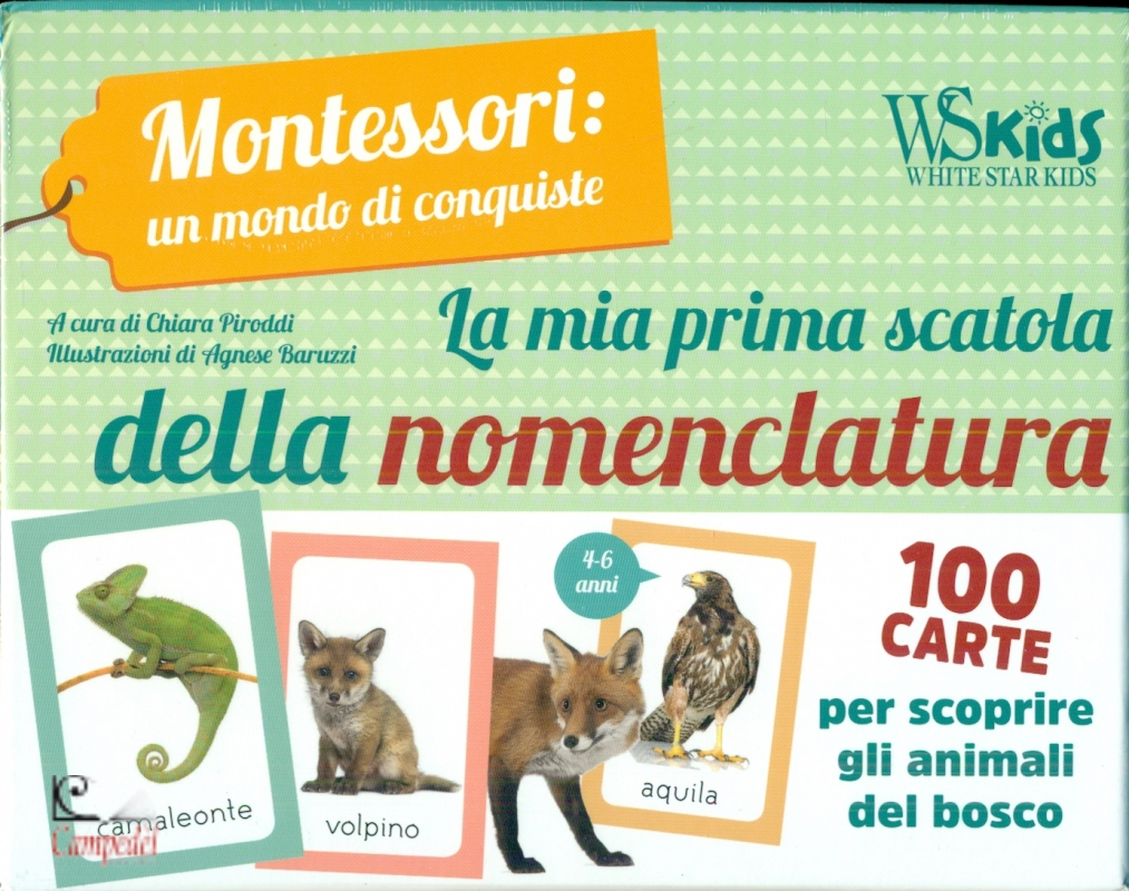 La mia prima scatola della nomenclatura. Montessori: un mondo di conquiste. Con gadget Chiara Piroddi pubblicato da White Star Collana White Star Kids Illustratore A. Baruzzi Dedicata ai bambini in età prescolare, questa scatola gioco è strutturata secondo i principi del metodo Montessori, per stimolare i piccoli all'apprendimento in autonomia, attraverso il gioco e la curiosità. In questa scatola il libretto si accompagna a 100 tessere "di nomenclatura", pensate per espandere il vocabolario dei bambini e stimolare la loro capacità di classificazione e categorizzazione attraverso i nomi degli animali del bosco. Età di lettura: da 5 anni. Libreria Campedèl | |