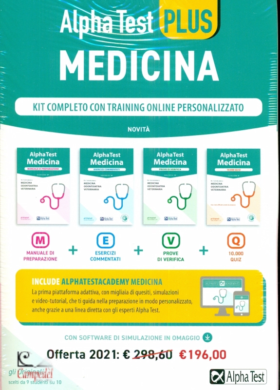 Alpha Test plus. Medicina. Kit completo di preparazione con training online personalizzato. Con software di simulazione pubblicato da Alpha Test Collana TestUniversitari Il nuovo Kit PLUS Medicina, aggiornato tenendo conto delle modifiche introdotte nei test ufficiali, č la soluzione pił completa e innovativa per prepararsi ai test di ammissione 2021/22 a Medicina. Odontoiatria, Veterinaria. Grazie al nuovo Kit PLUS, lo studio sui libri viene potenziato da AlphaTestAcademy, la prima piattaforma di training online adattiva e personalizzata. Il manuale e gli eserciziari che compongono il Kit PLUS Medicina dedicano ampio spazio alle domande di ragionamento logico, cultura generale, biologia, chimica, matematica e fisica, che hanno assunto particolare importanza nel test di ammissione all'Universitą di Medicina. AlphaTestAcademy accompagna lo studente passo passo nel lavoro di preparazione. Valuta il livello iniziale e, in base ai progressi compiuti, propone migliaia d i quesiti, video-tutorial e simulazioni online, integrando e potenziando lo studio sui libri. La piattaforma offre anche una linea diretta con gli esperti Alpha Test. Cosa comprende dunque il Kit PLUS Medicina? Il manuale, con la teoria essenziale per studiare o ripassare ogni argomento richiesto al test; un eserciziario con centinaia di domande commentate per mettersi alla prova e il software Alpha Test Player; le prove di verifica con 10 simulazioni di test composte da domande provenienti dai test degli ultimi anni e raccolte in un unico volume; una raccolta di migliaia di domande ufficiali suddivise per materia con tutte le soluzioni e il software Alpha Test Player; l'accesso ad AlphaTestAcademy facilmente attivabile seguendo le indicazioni riportate all'interno del manuale. Il software Alpha Test Player, scaricabile gratuitamente, permette di svolgere numerose prove simulate del test ufficiale visualizzando subito i risultati (richiede Windows 7 o superiore oppure mac OS 10.9 o superiore). Libreria Campedčl Belluno | |