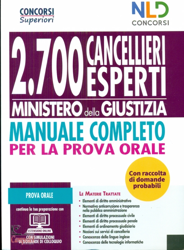 Concorso Cancellieri esperti 2020: manuale completo per la prova orale per il Concorso 2700 Cancellieri Ministero della giustizia. Con raccolta di domande probabili Editore: Nld Concorsi Collana: Concorsi superiori Data di Pubblicazione: dicembre 2020 In data 11 dicembre 2020, in Gazzetta Ufficiale è stato pubblicato il bando di concorso per l'assunzione di 2700 unità di personale non dirigenziale a tempo indeterminato per il profilo di Cancelliere esperto, da inquadrare nell'Area funzionale Seconda, Fascia economica F3, nei ruoli del personale del Ministero della Giustizia-Amministrazione Giudiziaria. La selezione si svolge per titoli e colloquio orale. La prova orale consisterà in un colloquio interdisciplinare volto ad accertare la preparazione e la capacità professionale dei candidati e verterà sulle seguenti materie: - elementi di diritto amministrativo (con particolare riferimento al procedimento amministrativo, al pubblico impiego e alle diverse responsabilità dei dipendenti pubblici), - - normativa anticorruzione e trasparenza nella pubblica amministrazione (con particolare riferimento alla legge 6 novembre 2012, n. 190 e al decreto legislativo 14 marzo 2013, n.33), - - elementi di diritto processuale civile, - - elementi di diritto processuale penale, - - elementi di ordinamento giudiziario, - - nozioni sui servizi di cancelleria, - - conoscenza della lingua inglese, attraverso una conversazione che accerti il possesso di competenze linguistiche almeno al livello B1 del Quadro comune europeo di riferimento per le lingue; - - conoscenza delle tecnologie informatiche, nonché delle competenze digitali volte a favorire processi di innovazione amministrativa e di trasformazione digitale della pubblica amministrazione, attraverso una verifica attitudinale di tipo pratico. Libreria Campedèl Belluno | |