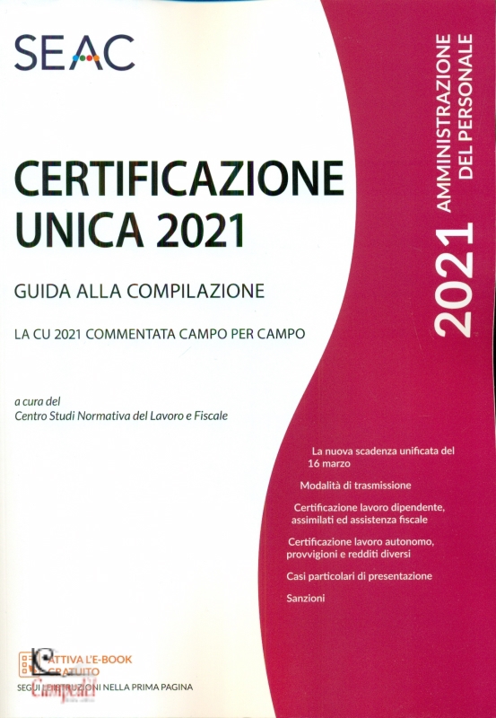Certificazione Unica. Guida alla compilazione La CU 2021 commentata campo per campo Centro Studi Normativa del Lavoro Seac pubblicato da Seac Collana: Amministrazione del personale La nuova scadenza unificata del 16 marzo Modalità di trasmissione Certificazione lavoro dipendente, assimilati ed assistenza fiscale Certificazione lavoro autonomo, provvigioni e redditi diversi Casi particolari di presentazione Sanzioni L’articolo 4 del DPR n. 322/1998, stabilisce, al comma 6-ter, che i sostituti d’imposta che hanno erogato redditi di lavoro dipendente e assimilati, redditi di lavoro autonomo, provvigioni e redditi diversi, rila-sciano una Certificazione Unica per attestare oltre ai dati fiscali anche i dati previdenziali e assistenziali. Fermo restando il termine del 28 febbraio per l’effettuazione delle operazioni di conguaglio, da quest’anno, i termini di consegna della CU sintetica ai percipienti e di trasmissione della CU ordinaria all’Agenzia delle Entrate sono ricondotti ad un’unica data: il 16 marzo, ciò a seguito delle modifiche apportate ai commi 6-quater e 6-quinquies, articolo 4 del DPR n. 322/1998 ad opera dell’articolo 16-bis del DL n. 124/2019 (c.d. Decreto Fiscale 2020). Per le sole CU contenenti esclusivamente redditi esenti o non dichiarabili mediante la dichiarazione precompilata (Mod. 730), rimane confermato al 31 ottobre (termine posticipato al 2 novembre per il 2021) il termine di trasmissione all’Agenzia delle Entrate analogamente a quanto previsto per il Mod. 770. Il sostituto d’imposta, tramite l’invio, all’Agenzia delle Entrate, delle CU ordinarie, assolve all’obbligo di dichiarazione a suo carico previsto dal comma 3-bis, articolo 4 del DPR n. 322/1998. L’obbligo di presentazione del Mod. 770, entro il 31 ottobre (2 novembre per il 2021), permane per i sostituti d’imposta che sono tenuti a comunicare dati non inclusi tra quelli previsti nella CU. La presente pubblicazione, tramite approfondimenti teorici e schematizzazioni, fornisce le indicazioni per la corretta compilazione della CU 2021, con particolare riguardo a: Frontespizio, in cui sono contenuti i dati anagrafici del sostituto d’imposta e dell’intermediario; Parte Dati Anagrafici, dove trovano esposizione i dati anagrafici relativi al datore di lavoro e al percettore delle somme; Certificazione dei redditi da lavoro dipendente e assimilati; Certificazione dei redditi di lavoro autonomo, di provvigioni e redditi diversi; Certificazione Redditi – Locazioni brevi. Particolare attenzione è stata riservata all’impatto, sulla compilazione della Certificazione Unica 2021, delle numerose misure di sostegno al reddito corrisposte dai sostituti d’imposta nel corso del 2020, in parte collegate all’emergenza epidemiologica da Covid-19 (trattamento integrativo, ulteriore detrazione fiscale, clausola di salvaguardia per incapienti, premio presenza del mese di marzo 2020). Libreria Campedèl Belluno | |