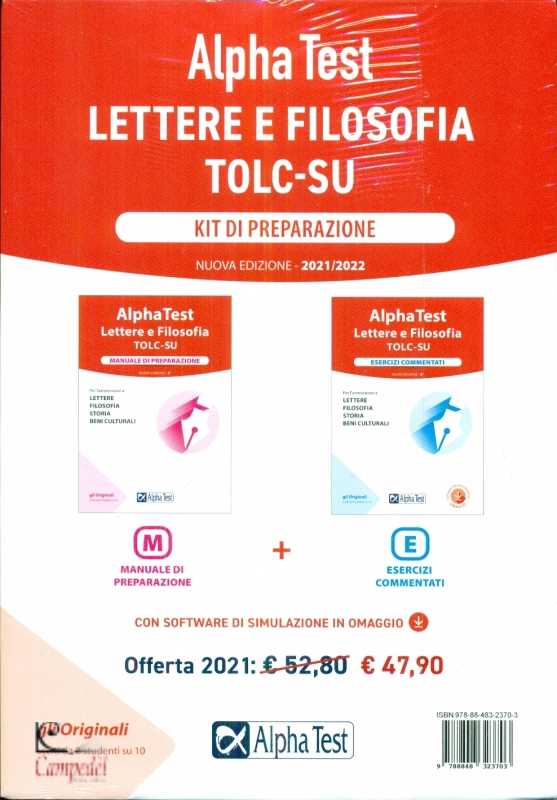 Alpha Test. Lettere e Filosofia. Kit di preparazione: Manuale di preparazione-Esercizi commentati. Nuova ediz. Con software di simulazione Paola Borgonovo - Ilaria Caretta - Fausto Lanzoni - Raffaella Reale - Giuseppe Vottari pubblicato da Alpha Test Collana TestUniversitari Questo kit rappresenta la soluzione più completa e aggiornata per prepararti ai test di ammissione a tutti i corsi di laurea dell'area di Lettere e Filosofia: Lettere, Filosofia, Storia, Beni culturali. Ogni li bro prevede la trattazione di tutti gli argomenti oggetto d'esame (competenze logiche e linguistiche, letteratura italiana, storia, filosofia, geografia, storia dell'arte, educazione civica, lingua inglese, lingua latina, cinema, musica e linguaggi dello spettacolo). Il kit comprende: il manuale, con la teoria essenziale per studiare o ripassare ogni argomento richiesto al test; l'eserciziario con i commenti per mettersi alla prova e chiarire ogni dubbio; Il software Alpha Test Player, scaricabile gratuitamente, permette di svolgere numerose prove simulate del test ufficiale visualizzando subito i risultati, anche in forma grafica. Richiede Windows 7 o superiore oppure macOS 10.9 o superiore. Libreria Campedèl Belluno | |