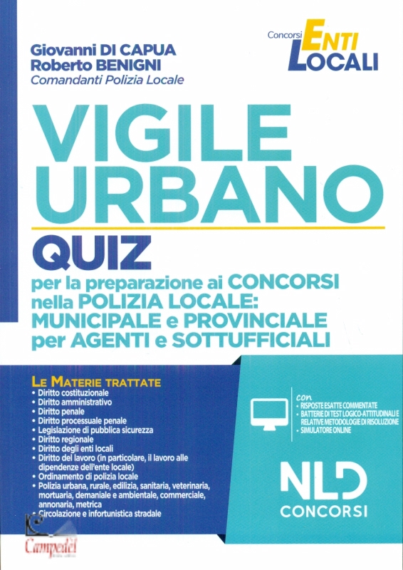 Vigile urbano. Quiz per la preparazione ai concorsi nella Polizia locale: municipale e provinciale per agenti e sottufficiali. Con Contenuto digitale per download e di Giovanni Di Capua, Roberto Benigni Editore: Nld Concorsi Collana: Concorsi enti locali Data di Pubblicazione: 2021 Materie: - Diritto costituzionale - Diritto amministrativo - Diritto penale - Reati contro la P.A. - Depenalizzazione - Diritto processuale penale - Legislazione d i pubblica sicurezza - Elementi di disciplina degli enti pubblici locali - Diritto del lavoro (in particolare alle dipendenze dell’E.L.) - Circolazione e infortunistica stradale - Elementi di Ordinamento della Polizia Locale: urbana rurale edilizia sanitaria veterinaria mortuaria demaniale ambientale commerciale annonaria metrica - Per ogni domanda sono previste quattro possibili risposte, tra le quali viene indicata, di seguito ad ogni argomento, quella esatta, con un commento agile e puntuale, tale da fornire un valido aiuto nella comprensione degli argomenti. Una formula in linea con le più aggiornate esperienze della didattica concorsuale, che offre al concorrente il vantaggio di familiarizzare con i test a risposta multipla. - Contestualmente i commenti consentono di ripassare le materie previste dalle prove di concorso. - Il volume è completato da una batteria di TEST LOGICO-ATTITUDINALI, anch'essi presenti nei vari concorsi, - da una APPENDICE SUL MODELLO UE di PATENTE di GUIDA e dalla TABELLA DEI PUNTI SOTTRATTI DALLA PATENTE di GUIDA PER LE VIOLAZIONI AL CDS. Libreria Campedèl Belluno | |