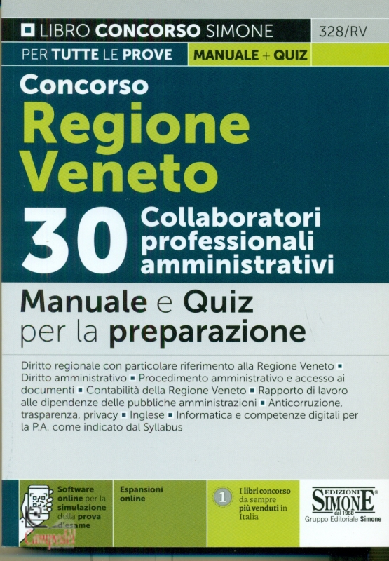 Concorso Regione Veneto 30 Collaboratori professionali amministrativi Pubblicato da Simone Collana: Libro concorso Manuale e Quiz per la preparazione – Diritto regionale con particolare riferimento alla Regione Veneto – Diritto amministrativo – Procedimento amministrativo e accesso ai documenti – Contabilità della Regione Veneto – Rapporto di lavoro alle dipendenze delle pubbliche amministrazioni – Anticorruzione, trasparenza, privacy – Inglese – Informatica e competenze digitali per la P.A. come indicato dal Syllabus – Software online per la simulazione della prova d’esame – Espansioni online Il manuale Concorso Regione Veneto 30 collaboratori professionali amministrativi è diretto alla preparazione della prova scritta e orale prevista dal bando pubblicato nella Gazzetta Ufficiale n. 58 del 23 luglio 2021. Il testo, in aderenza al bando, è così strutturato: — Parte I – Elementi di diritto amministrativo, con particolare riferimento al procedimento amministrativo e al diritto di accesso; — Parte II – Elementi di diritto regionale, con particolare riferimento all’ordinamento della Regione Veneto; — Parte III – Elementi di contabilità della Regione Veneto; — Parte IV – Normativa in materia di rapporto di lavoro alle dipendenze delle pubbliche amministrazioni; — Parte V – Normativa in materia di anticorruzione, trasparenza e privacy; — Parte VI – Lingua inglese; — Parte VII – Informatica e competenze digitali per la P.A.; — Parte VIII – Questionari. Arricchiscono la trattazione, inoltre, le espansioni online semplificate (utili per coloro che studiano il diritto per la prima volta), quelle di approfondimento e sulla normativa d’interesse (es. Statuto della Regione Veneto). Infine, grazie al software online, contenente ulteriori quiz su tutte le materie d’esame, sarà possibile esercitarsi in infinite simulazioni della prova concorsuale. Libreria Campedèl Belluno | |