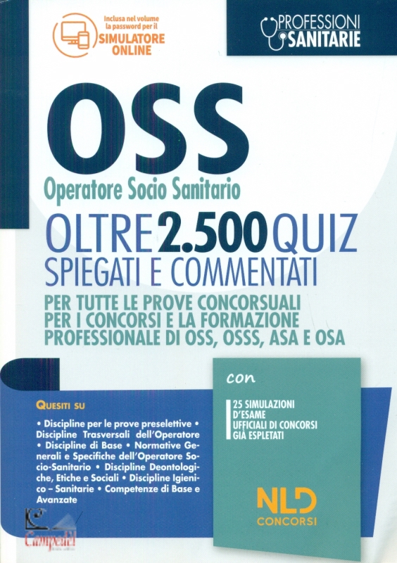 Quiz concorso per OSS 2021 Operatore Socio Sanitario. Oltre 2500 quiz spiegati e commentati. Per tutte le prove concorsuali per i concorsi e la formazione professionale Editore: Nld Concorsi Data di Pubblicazione: ottobre 2021 Nel volume vengono offerti oltre 2500 quiz commentati a risposta multipla che puntano al ripasso degli argomenti più svariati. I quesiti hanno lo scopo di mettere alla prova su tecniche e procedure sanitarie affrontando una serie di domande dedicate alle: Discipline per le prove preselettive (Cultura Generale, Logica e Italiano); Discipline Trasversali dell’Operatore (Informatica, Matematica e Geometria, Fisica, Statistica e Inglese) Discipline di Base (Biologia, Chimica, Anatomia e Medicina); normative Generali e Specifiche dell’Operatore Socio-Sanitario (Legislazione Sanitaria, Normativa giuridica dell’OSS, Management e Rischio Clinico); Discipline Deontologiche, Etiche e Sociali (Deontologia e Sicurezza nei luoghi di lavoro, Psicologia e Assistenza Sociale); Discipline Igienico – Sanitari (Igiene e Cultura Specifica); Competenze di Base e Avanzate (Emergenza e Urgenza) e Prestazioni operative dell’OSS. Infine, l’ultima parte è dedicata alle Simulazioni d’esame e offre 25 simulazioni d’esame ufficiali di concorsi già espletati al fine di verificare la preparazione e le conoscenze del candidato su tutte le materie oggetto della prova scritta. Infine, con la password in coda al volume, è possibile avere accesso al SIMULATORE ONLINE, ed esercitarsi con svariati quiz divisi per argomento Libreria Campedèl Belluno | |