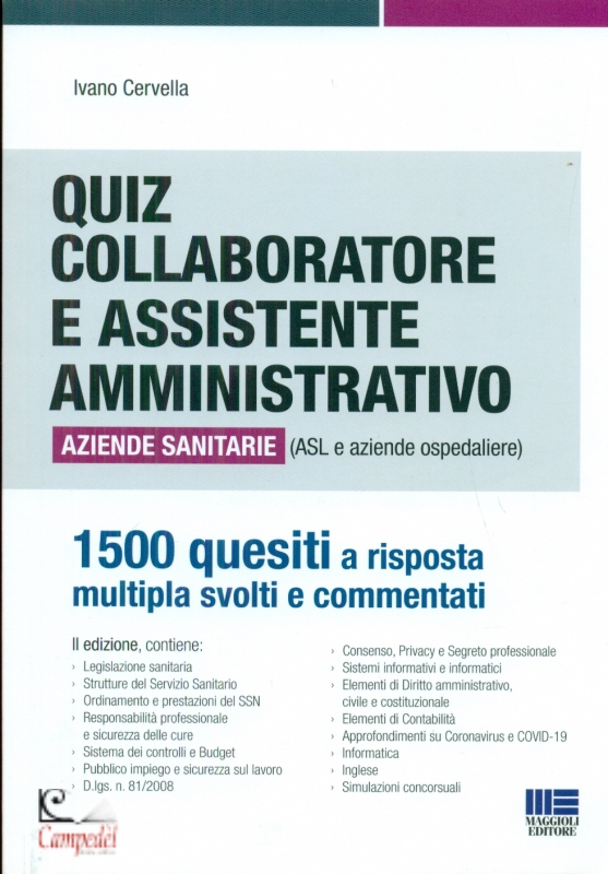 Quiz Collaboratore e Assistente amministrativo Aziende sanitarie (ASL e aziende ospedaliere) 1500 quesiti a risposta multipla svolti e commentati Autori Ivano Cervella Editore Maggioli Editore Pubblicazione Luglio 2021 (II Edizione) ISBN / EAN 8891651655 / 9788891651655 Collana Concorsi&Esami II edizione, contiene: › Legislazione sanitaria › Strutture del Servizio Sanitario › Ordinamento e prestazioni del SSN › Responsabilitą professionale e sicurezza delle cure › Sistema dei controlli e Budget › Pubblico impiego e sicurezza sul lavoro › D.lgs. n. 81/2008 › Consenso, Privacy e Segreto professionale › Sistemi informativi e informatici › Elementi di Diritto amministrativo, civile e costituzionale › Elementi di Contabilitą › Approfondimenti su Coronavirus e COVID-19 › Informatica › Inglese › Simulazioni concorsuali Nella sezione online, raggiungibile seguendo le istruzioni riportate in fondo al libro, sono disponibili ulteriori quiz, simulazioni e contenuti aggiuntivi di interesse per la preparazione al concorso. Libreria Campedčl Belluno | |