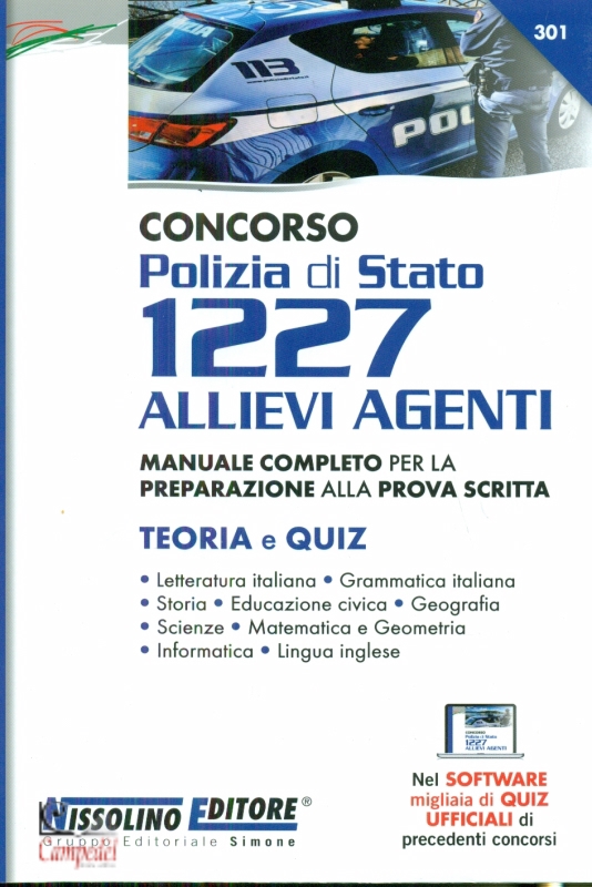 Concorso Polizia di Stato 1227 Allievi Agenti Pubblicato da Nissolino editore Manuale completo per la preparazione alla prova scritta – Teoria e Quiz – Letteratura italiana – Grammatica italiana – Storia – Educazione civica – Geografia – Scienze – Matematica e Geometria – Informatica – Lingua inglese – Nel SOFTWARE migliaia di QUIZ UFFICIALI di precedenti concorsi Edizione: 2021 Il manuale «Concorso Polizia di Stato – 1227 allievi agenti» è un testo completo per la preparazione alla prova scritta del concorso, bandito sulla G.U. n. 56 del 16 luglio 2021, riservato ai volontari in ferma prefissata di un anno (VFP1) in servizio da almeno sei mesi continuativi, o in rafferma annuale, o collocati in congedo al termine della ferma annuale, e ai volontari in ferma quadriennale (VFP4) in servizio o in congedo. Il testo, che propone teoria e quiz, aderisce perfettamente alle indicazioni del bando, secondo cui la prova d’esame consisterà in un questionario composto da domande con risposta a scelta multipla riguardanti argomenti di cultura generale e materie della scuola media dell’obbligo, tese anche ad accertare un sufficiente livello di conoscenza dell’Inglese e dell’Informatica, in linea con gli standard europei. Pertanto la trattazione comprende: – Letteratura italiana; – Grammatica italiana; – Storia; – Educazione civica; – Geografia; – Scienze; – Matematica e Geometria; – Informatica; – Lingua inglese (quiz con risposte commentate). A completamento dell’opera, un software (accessibile nell’area riservata) con migliaia di quiz ufficiali di precedenti concorsi, per infinite esercitazioni e simulazioni della prova d’esame. Libreria Campedèl Belluno | |