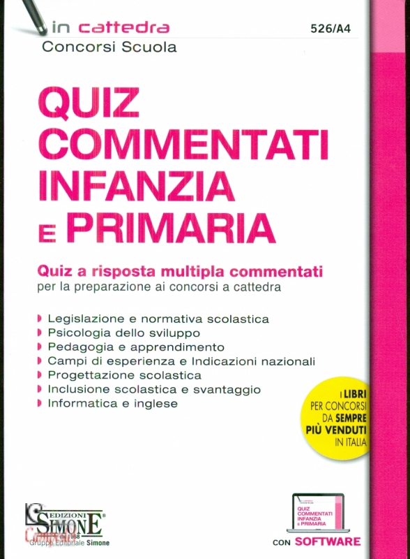 Quiz commentati infanzia e primaria. Quiz a risposta multipla commentati per la preparazione ai concorsi a cattedra. Con software di simulazione Editore:Edizioni Giuridiche Simone Collana:In cattedra Data di Pubblicazione:2021 Il manuale «Quiz Commentati infanzia e primaria» è pensato per la preparazione ai concorsi a cattedra in cui sono presenti prove a quiz a risposta multipla ed è relativo ai programmi delle classi di concorso 00AAe 00EE Infanzia e Primaria. Il te sto, che copre i contenuti del programma concorsuale, è articolato in sette parti: — Parte Prima – Normativa scolastica: i quiz riguardano la normativa scolastica, gli ordinamenti relativi al primo ciclo di istruzione e i documenti europei in materia educativa; — Parte Seconda – Psicologia dello sviluppo: relativa alla psicologia dell’età evolutiva, con particolare attenzione alle fasi dello sviluppo cognitivo, sociale, emotivo e del linguaggio; — Parte Terza – Pedagogia e apprendimento: pro pone quiz relativi ai presupposti teorici e pratici del processo educativo e dell’apprendimento, concentrandosi sui risvolti didattici e metodologici, sulle modalità della relazione educativa nonché di quella tra scuola, famiglia e ambiente; — Parte IV – Inclusione: presenta quiz centrati sulle pratiche didattiche finalizzate all’inclusione di alunni con bisogni educativi speciali, alla promozione delle pari opportunità e al rispetto delle differenze; — Parte V – Progettazione didattica: affrontano tematiche relative alla progettazione e programmazione di attività didattiche e la loro applicazione in classe; — Parte VI – Informatica: con schede per un rapido ripasso e quiz commentati; — Parte VII – Inglese: con schede di grammatica inglese e quiz commentati; I questionari commentati, che raccolgono oltre 500 quesiti, prevedono domande con quattro risposte corredate di una esaustiva spiegazione. A completamento del testo un software con migliaia di quiz per simulare la prova d’esame. Libreria Campedèl Belluno | |