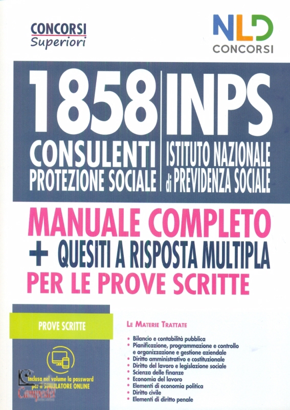 1858 Consulenti protezione sociale INPS. Manuale completo + quesiti a risposta multipla per le prove scritte Editore:Nld Concorsi Collana:Concorsi superiori Data di Pubblicazione:ottobre 2021 Le materie trattate - Bilancio e contabilità pubblica - Pianificazione programmazione e controllo e organizzazione e gestione aziendale - Diritto amministrativo e costituzionale - Diritto del Lavoro e legislazione sociale - Scienza delle finanze - Economia del lavoro - Elementi di economia politica - Diritto civile - Elementi di diritto penale Libreria Campedèl Belluno | |