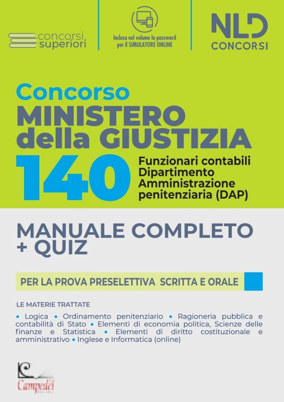 Concorso 140 posti Ministero della Giustizia. Funzionari contabili: manuale completo + quiz per la prova preselettiva scritta e orale. Con software di simulazione Editore: Nld Concorsi Categoria: Amministrazione pubblica Data di Uscita: 20/01/2022 In data 28 dicembre 2021, sulla Gazzetta Ufficiale, è stato pubblicato il bando di concorso per l'assunzione di 140 funzionari contabili nei ruoli del personale del Ministero della Giustizia - Dipartimento dell'amministrazione penitenziaria (DAP). L'Amministrazione si riserva la facoltà di far precedere la prova scritta da una prova preselettiva, che consisterà in un questionario a risposta multipla, composto da una serie di domande di carattere attitudinale finalizzate alla verifica: della capacità logico-deduttiva, di ragionamento logico-matematico e criticoverbale; le materie d'esame della prova scritta e orale. La prova scritta consisterà in una serie di domande a risposta multipla vertenti sulle seguenti materie: Ordinamento penitenziario, con particolare riferimento all'organizzazione degli istituti e servizi dell'Amministrazione Penitenziaria. Ragioneria pubblica e contabilità di Stato con particolare riferimento ai servizi amministrativo contabili dell'Amministrazione. La prova orale verterà sulle materie oggetto della prova scritta e inoltre sulle seguenti materie: Elementi di economia politica, di scienza delle finanze e di statistica. Elementi di diritto costituzionale ed amministrativo con particolare riferimento al rapporto di pubblico impiego. La prova orale comprenderà anche l'accertamento della conoscenza della lingua straniera prescelta e delle capacità e attitudini all'uso di apparecchiature e applicazioni informatiche. Il presente volume costituisce un valido ed efficace strumento per la preparazione alla prova preselettiva, scritta e orale del concorso, contenendo una sintetica ma dettagliata trattazione teorica delle suddette materie, accompagnata da una selezione ragionata di quiz. Completa il volume il simulatore online, con il quale è possibile esercitarsi con batterie di domande a risposta multipla, sulla scorta delle banche dati dei concorsi degli anni precedenti e aventi ad oggetto ciascuna delle materie oggetto del volume. Libreria Campedèl Belluno | |
