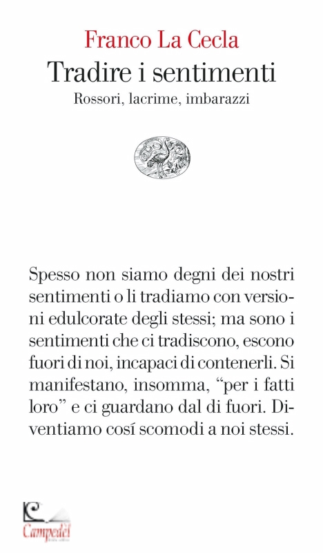 Tradire i sentimenti. Rossori, lacrime, imbarazzi Autore: La Cecla Franco Editore: Einaudi Categoria: Scienze sociali Data di Uscita: 08/02/2022 Collana: Vele «Tradire i sentimenti», questa bellissima espressione italiana, significa sia che spesso non siamo degni dei nostri sentimenti o che li tradiamo con versioni edulcorate degli stessi; ma vuol dire inoltre che sono i sentimenti a tradirci, escono fuori di noi che non siamo capaci di contenerli. Si manifestano "per i fatti loro" e ci guardano dal di fuori. Ci tradiscono con chi abbiamo intorno, estranei e non. Il risultato sono rossori, lacrime, sospiri, imbarazzi, sudori, brividi e pelle d'oca. Insomma, accade che diventiamo scomodi a noi stessi. E di tale scomoditą parla Franco La Cecla, in questo libro che, forse, vi darą un qualche fastidio, una irritazione per quanto passeggera, una sensazione di imbarazzo Libreria Campedčl Belluno | |