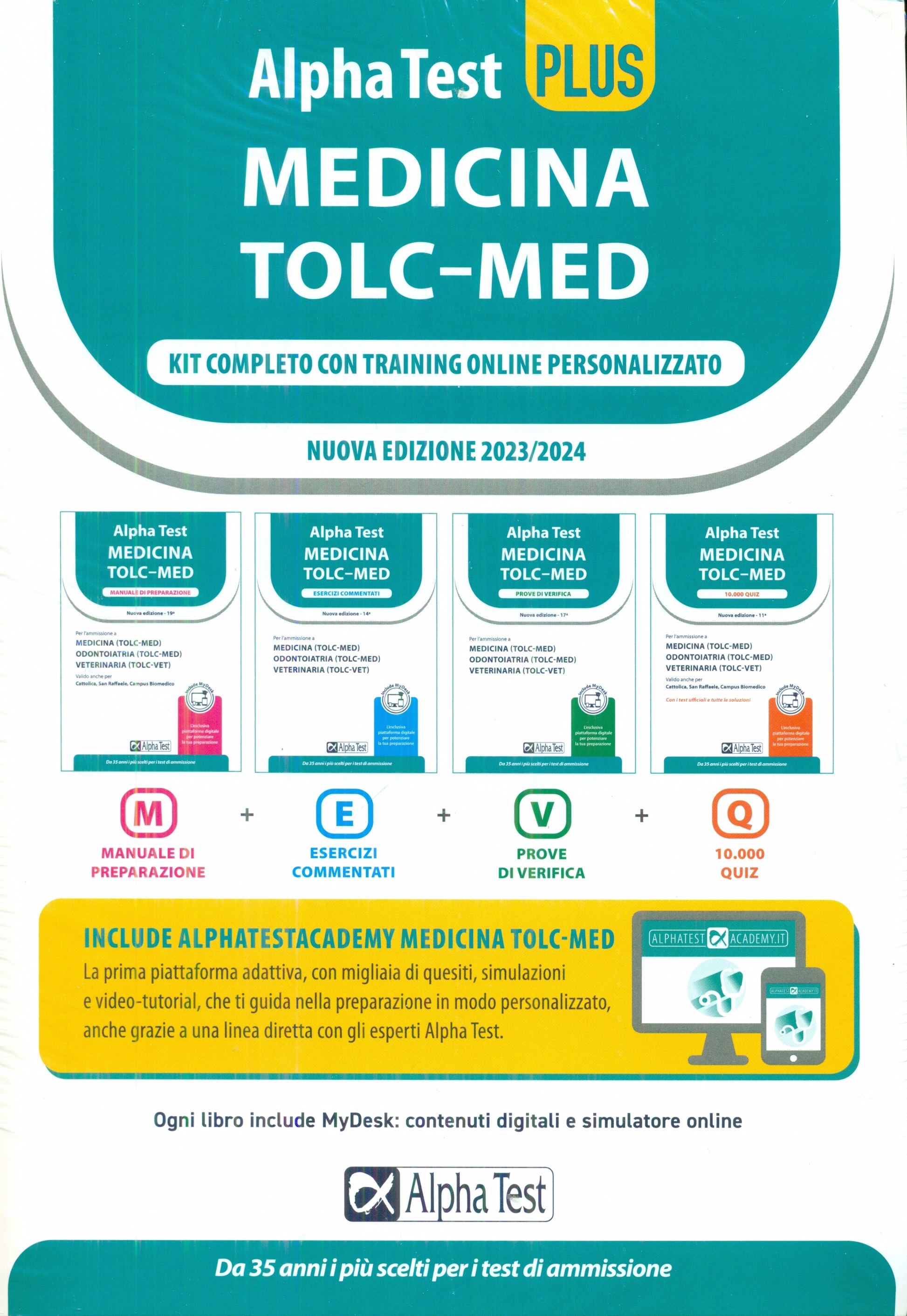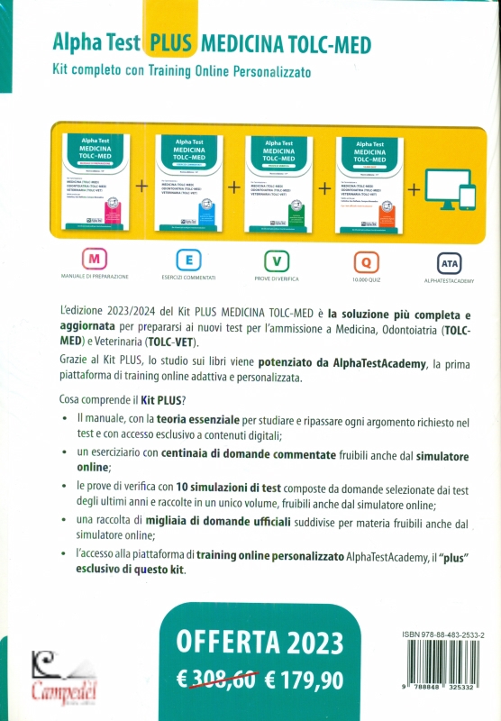 Alpha Test PLUS Medicina TOLC-MED. Kit completo di preparazione con training on line. Con estensioni online • Editore: Alpha Test • Collana: TestUniversitari • Data di Pubblicazione: ottobre 2022 • • Alpha Test Plus Medicina TOLC-MED - Kit completo di preparazione con training on line personalizzato. Nuova edizione 2023/2024, include AlphaTestAcademy Medicina TOLC-MED: la prima piattaforma adattiva, con migliaia di quesiti, simulazioni e video-tutorial, ch e ti guida nella preparazione in modo personalizzato, anche grazie a una linea diretta con gli esperti Alpha Test. Ogni libro include MyDesk: contenuti digitali e simulatore online. L'edizione 2023/2024 del Kit Plus Medicina TOLC-MED è la soluzione più completa e aggiornata per prepararsi ai nuovi test per l'ammissione a Medicina, Odontoiatria (TOLC-MED) e Veterinaria (TOLC-VET). Grazie al Kit Plus, lo studio sui libri viene potenziato da AlphaTestAcademy, la prima piattaforma di training online adattiva e personalizzata. Cosa comprende il Kit Plus? Il manuale, con la teoria essenziale per studiare e ripassare ogni argomento richiesto nel test e con accesso esclusivo a contenuti digitali; un eserciziario con centinaia di domande commentate fruibili anche dal simulatore online; le prove di verifica con 10 simulazioni di test composte da domande selezionate dai test degli ultimi anni e raccolte in un unico volume, fruibili anche dal simulatore online; una raccolta di migliaia di domande ufficiali suddivise per materia fruibili anche dal simulatore online; l'accesso alla piattaforma di training online personalizzato AlphaTestAcademy, il "plus" esclusivo di questo kit. Libreria Campedèl Belluno | |