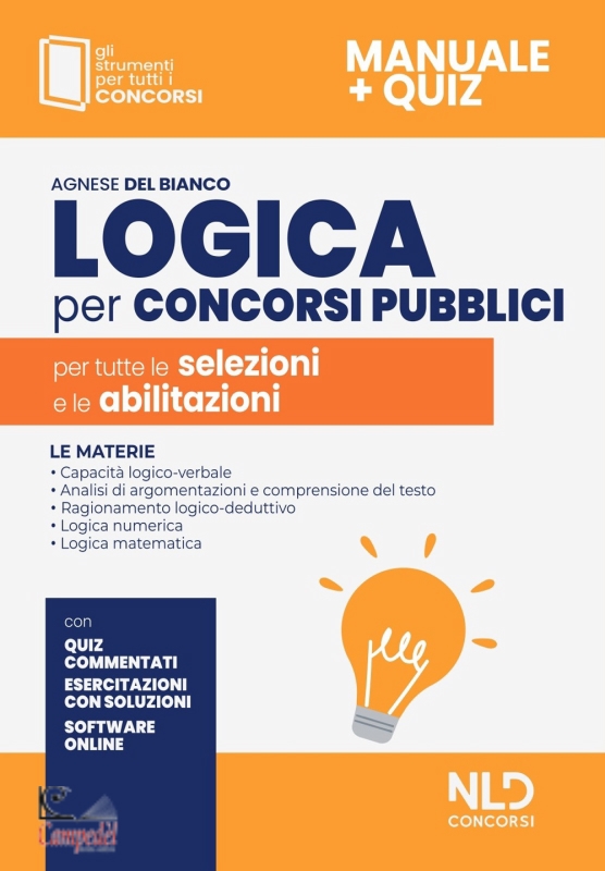 Logica per concorsi pubblici. Per tutte le selezioni e le abilitazioni. Con software di simulazione • Autore: Del Bianco Agnese • Editore: Nld Concorsi • Data di Uscita: 12/12/2022 Il manuale "Logica per concorsi e abilitazioni" rappresenta uno strumento mirato per chiunque si appresti a sostenere le prove preselettive e scritte dei concorsi banditi dalle varie amministrazioni pubbliche per diplomati e laureati. La logica costituisce, infatti, una delle materie più frequenti - nonché ostiche - richieste ai candidati in sede di concorso. Pertanto, per agevolare la preparazione e lo studio, il testo contiene le seguenti Parti: Parte I - Logica con approfondimento dei principali argomenti di logica richiesti nei concorsi pubblici 2023 ossia capacità logico-verbale, analisi di argomentazioni e comprensione del testo, ragionamento logicodeduttivo, logica numerica, logica matematica; Parte II - Quiz commentati; Parte III - Esercitazioni con soluzioni; Pertanto, dopo una disamina teorica delle varie chiavi di risoluzione dei quesiti di logica, il testo si dedica alle simulazioni d'esame con quiz commentati ed esercitazioni volte a verificare la preparazione in vista delle prove d'esame. Completa il testo, l'innovativo simulatore online, accessibile con la password presente all'interno del volume, che permette al concorsista di esercitarsi con infinite simulazioni, anche tratte da banche dati ufficiali. Libreria Campedèl Belluno | |
