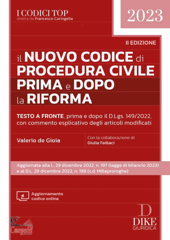 CTPC – Il nuovo codice di procedura civile prima e dopo la riforma TESTO A FRONTE, prima e dopo il D.Lgs. 149/2022, con commento esplicativo degli articoli modificati – Aggiornamento codice online Pubblicato da: Dike giuridica Collana: I codici TOP Il nuovo codice di procedura civile prima e dopo la riforma 2023 costituisce un indispensabile strumento per una immediata comprensione del nuovo codice di procedura civile introdotto dalla riforma Cartabia (D.Lgs. 10 ottobre 2022, n . 149), come modificata dalla L.29 dicembre 2022, n. 197 (legge di bilancio 2023) e dal D.L. 29 dicembre 2022, n. 198 (c.d. decreto milleproroghe). A tal fine tutte le norme modificate riportano, in modo comparato, la disciplina previgente e quella in vigore a partire dal 1 gennaio 2023. Nella nuova disposizione, inoltre, le parti novellate del testo normativo sono evidenziate in grassetto, quelle abrogate in corsivo. Inoltre, sotto ciascuna previsione normativa innovata č riportato un utilissimo commento che evidenzia le novitą, teoriche e pratiche, derivanti dalla riforma, aggiornato alla pił rilevate e significativa giurisprudenza nazionale ed europea. Libreria Campedčl Belluno | |