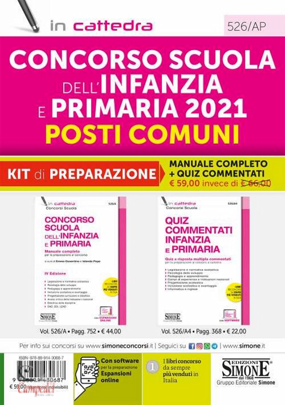 Concorso Scuola dell'infanzia e primaria 2021. Posti comuni. Kit di Preparazione. Manuale completo + quiz commentati. Con espansione online. Con software di simulazione • Editore: Edizioni Giuridiche Simone • Data di Uscita: 09/11/2021 • Collana: In cattedra Il KIT di preparazione Concorso Scuola dell'Infanzia e Primaria 2021 Posti comuni comprende: "Concorso Scuola dell'Infanzia e Primaria Manuale completo per la preparazione al concorso" e "Quiz Commentati Infanzia e Primaria. Quiz a risposta multipla commentati per la preparazione ai concorsi a cattedra". Libreria Campedèl Belluno | |