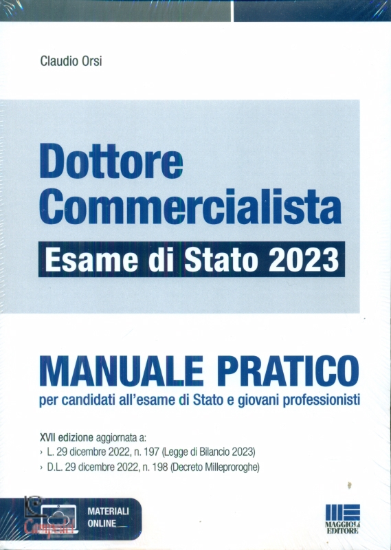Dottore commercialista. Esame di Stato 2023. Manuale pratico di Claudio Orsi • Editore: Maggioli Editore • Edizione: 17 • Data di Pubblicazione: febbraio 2023 • • Il Manuale pratico per l'Esame di abilitazione per Commercialista si pone l'obiettivo di illustrare tutte le principali materie che il dottore commercialista affronta quotidianamente nella propria professione (diritto tributario, contabilità, diritto commerciale, diritto fallimentare, ecc.), aggiornate con le più recenti riforme e modifiche normative, attraverso una trattazione sintetica ma esaustiva. La schematicità dell'esposizione (indispensabile per fornire un valido supporto al candidato nello studio della vastità delle nozioni e degli argomenti che possono essere oggetto della prova d'esame), unita alla possibilità di approfondire singole tematiche (seguendo le tracce delle norme di volta in volta indicate), rende il libro particolarmente adatto per chi deve affrontare l'esame di Stato per l'abilitazione professionale. Il "Manuale" è un efficace strumento riassuntivo dei vari argomenti che potranno essere richiesti sia all'atto della prova scritta sia di quella orale; grazie ai continui richiami a normativa e prassi di riferimento, consente di avere immediata contezza dei provvedimenti da ricercare per ottenere ulteriori informazioni, soprattutto con riguardo a quegli aspetti della vita professionale che non si è avuto ancora modo di conoscere direttamente perché non vist i concretamente applicati nel corso del praticantato. Nella sezione online, raggiungibile seguendo le istruzioni riportate in fondo al libro, saranno disponibili eventuali aggiornamenti normativi. Libreria Campedèl Belluno | |