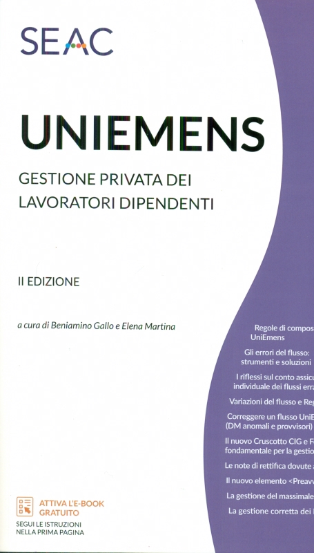 Gallo Beniamino – Elena Martina UNIEMENS Gestione privata dei lavoratori dipendenti Pubblicato da: SEAC collana: Amministrazione del personale Regole di composizione del flusso UniEmens: schemi sintetici ed esempi di compilazione Gli errori del flusso: quando si manifestano, dove si vedono, come si interviene. Strumenti e soluzioni I riflessi sul conto assicurativo individuale dei flussi errati Variazioni del flusso e Regolarizzazioni Correggere un flusso UniEmens squadrato (DM anomali e provvisori): effetti su DURC DPA e agevolazioni contributive Il nuovo Cruscotto CIG e Fondi: strumento fondamentale per la gestione della CIG Le note di rettifica dovute alla CIG Il nuovo elemento La gestione del massimale contributivo La gestione corretta dei Dirigenti La pubblicazione, alla seconda edizione, rappresenta una guida indispensabile per i datori di lavoro privato, i committenti e gli intermediari che inviano mensilmente il flusso UniEmens per i lavoratori iscritti alla Gestione privata dell’INPS, in quanto contiene un’analisi approfondita dei singoli elementi della denuncia telematica e ne illustra le modalità di invio e gestione. Il volume si presta a livelli diversi di lettura, sia per utenti esperti sia per persone che iniziano l’esperienza di lavoro con i flussi Uniemens. Il testo, infatti, è corredato da schemi ed esempi pratici d i compilazione del flusso UniEmens. I vari aspetti di gestione sono esposti dando evidenza degli effetti delle attività svolte, in modo da rendere più trasparente il flusso e quindi più consapevole il suo utilizzo. Nella sezione I viene illustrato in maniera completa il percorso del flusso Uniemens. I capitoli esplorano gli aspetti che vanno dalla nascita dei dati in procedura paghe, fino all’elaborazione finale in INPS. Qui si esaminano anche le quadrature dei DM, le variazioni, i VIG e la gestione dei principali errori, senza dimenticare i problemi legati al DURC e alla decadenza dei conguagli CIG. Sono, infine, riepilogati gli strumenti di monitoraggio dei flussi, con l’analisi degli errori sul conto individuale dei lavoratori. Nella sezione II viene trattato approfonditamente il tema della CIG: dall’esposizione dei dati nei flussi, alla ricostruzione del montante disponibile, alla nascita delle note di rettifica e alla gestione delle stesse. L’approccio è metodologico, affinché aziende e intermediari possano comprendere come si costruiscono i dati, perché e quando si generano gli errori e dove intervenire in caso di problemi. Viene inoltre illustrata la procedura INPS “Cruscotto CIG e fondi”, strumento indispensabile da conoscere per gestire le note di rettifica derivanti dall’errata esposizione nel flusso della CIG e dei Fondi di solidarietà. Nella sezione III sono illustrati con esempi di compilazione i momenti salienti della gestione del dipendente, dall’assunzione, alla scelta del TFR, alla cessazione del rapporto. Sono inoltre illustrati rapporti di lavoro particolari (part-time, lavoratori a domicilio, lavoratori intermittenti, lavoratori all’estero, ecc.) e le regole di compilazione del flusso per particolari categorie di datori di lavoro. Nella sezione IV sono illustrate le assunzioni agevolate e gli sgravi, mentre nella sezione V sono affrontate le prestazioni previdenziali, i congedi e i permessi. La sezione VI tratta la Gestione separata nell’UniEmens. Nella sezione VII, infine, si riassumono in modo semplice e intuitivo i percorsi per trovare sul nuovo sito dell’INPS le informazioni ed effettuare i monitoraggi descritti nel volume. Libreria Campedèl Belluno | |