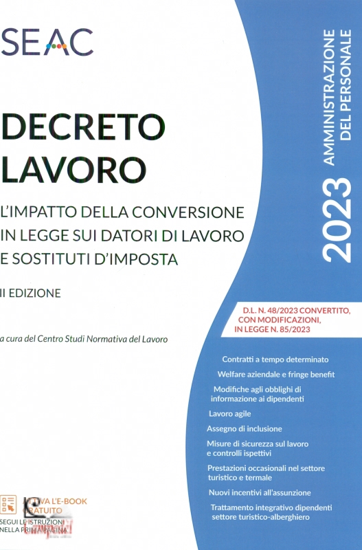 DECRETO LAVORO 2023 II Edizione Pubblicato da: SEAC Collana: Amministrazione del personale Contratti a tempo determinato Welfare aziendale e fringe benefit Modifiche agli obblighi di informazione ai dipendenti Lavoro agile Assegno di inclusione Misure di sicurezza sul lavoro e controlli ispettivi Prestazioni occasionali nel settore turistico e termale Nuovi incentivi all’assunzione Trattamento integrativo dipendenti settore turistico-alberghiero L’impatto della conversione in legge su datori di lavoro e sostituti d’imposta. DL n. 48/2023 convertito, con modificazioni, in Legge n. 85/2023. Il volume analizza i provvedimenti di interesse per i datori di lavoro nella gestione dei rapporti di lavoro dipendente, approvati nell’ambito del cosiddetto “Decreto Lavoro”, alla luce della conversione in legge, quale primo provvedimento organico in materia adottato dall’attuale Governo. Seguendo l’articolato del decreto, la prima sezione, dedicata alle misure di inclusione sociale e lavorativa, analizza la nuova misura a contrasto alla povertà, alla fragilità e all’esclusione sociale delle fasce deboli attraverso percorsi di inserimento sociale, di formazione, lavoro e di politiche attive del lavoro, denominata “Assegno di inclusione”. Sono oggetto di trattazione anche le modifiche alla disciplina del reddito di cittadinanza, di cui v iene confermata l’abolizione a partire dal nuovo anno, e l’introduzione del nuovo incentivo per l’assunzione dei beneficiari dell’assegno di inclusione. La seconda sezione è dedicata alle misure adottate in materia di sicurezza sul lavoro e di controlli ispettivi, volte a rafforzare il sistema delle regole a tutela della sicurezza del lavoro, anche mediante l’estensione della tutela antinfortunistica a soggetti che in precedenza ne erano sprovvisti, come gli alunni e il personale docente della scuola impegnati in attività di istruzione e formazione, della formazione terziaria professionalizzante e della formazione superiore. Nella terza sezione sono racchiuse le misure in materia di politiche sociali e lavoro, tra le quali spiccano sicuramente le modifiche alla disciplina delle causali del contratto a tempo determinato (Capo III, D.Lgs n. 81/2015) e la semplificazione degli obblighi informativi in capo al datore di lavoro previsti dal D.Lgs n. 152/1997, così come modificato dal “Decreto Trasparenza” (D.Lgs n. 104/2022). Rilevanti sono anche i nuovi incentivi alle assunzioni di giovani e di persone con disabilità, quali ulteriori misure a sostegno dell’occupazione di fasce di popolazione che accedono a fatica al mondo del lavoro, e l’ulteriore proroga del diritto al lavoro agile per i lavoratori cd. fragili e per i genitori con figli minori di 14 anni. Sono analizzate anche le modifiche alle sanzioni amministrative per omesso versamento delle ritenute previdenziali, al contratto di espansione e alle pr estazioni occasionali per i settori turismo e termale. Da ultimo, la quarta sezione affronta le tre misure a sostegno dei lavoratori per la riduzione della pressione fiscale, cioè l’estensione per il secondo semestre del 2023 dell’esonero parziale dei contributi previdenziali a carico dei lavoratori dipendenti e l’aumento a 3.000 euro del limite di esenzione dei fringe benefit per i lavoratori dipendenti con figli a carico, quale misura per incentivare ulteriormente il welfare aziendale. Infine, è analizzato il nuovo trattamento integrativo spettante ai lavoratori dipendenti del settore turistico – alberghiero e commisurato alle prestazioni di lavoro notturno e festivo svolte nel periodo dal 1° giugno al 21 settembre 2023. (Per scaricare la NORMATIVA puoi accedere alla Libreri@ Seac in alto al centro del sito, aprendo il volume, cliccando nel menu a tendina della voce "scarica allegati". Qui trovi una guida al download!) Libreria Campedèl Belluno | |