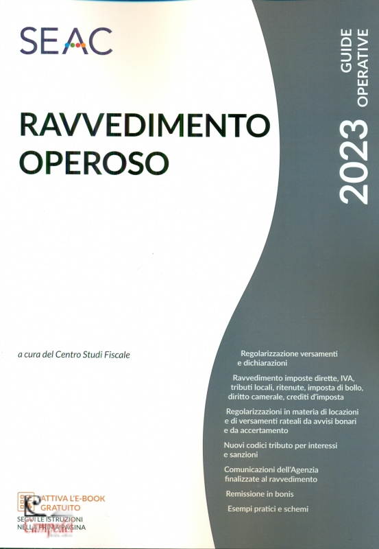 Centro studi fiscale Seac RAVVEDIMENTO OPEROSO Pubblicato da: SEAC Collana: Guide operative Regolarizzazione versamenti e dichiarazioni Ravvedimento imposte dirette, IVA, tributi locali, ritenute, imposta di bollo, diritto camerale, crediti d’imposta Regolarizzazioni in materia di locazioni e di versamenti rateali da avvisi bonari e da accertamento Nuovi codici tributo per interessi e sanzioni Comunicazioni dell’Agenzia finalizzate al ravvedimento Remissione in bonis Esempi pratici e schemi Negli ultimi tempi la gestione del rapporto tra fisco e contribuente è stata rivoluzionata, puntando ad un modello di collaborazione che favorisca al massimo l’adempimento spontaneo degli obblighi tributari; l’istituto del ravvedimento operoso è applicabile senza limiti di tempo e a prescindere dalla circostanza che la violazione sia già stata constatata o che siano iniziate ispezioni, verifiche o altre attività amministrative di accertamento. Il ravvedimento permette di regolarizzare errori ed omissioni beneficiando di uno sconto sulle sanzioni, che può variare da 1/10 del minimo (ravvedimento entro trenta giorni) ad 1/5 del minimo (ravvedimento dopo la consegna del PVC). Le principali novità in tema di ravvedimento riguardano: i nuovi codici tributo, istituti tramite la Risoluzione n. 12/2023 e la Risoluzione n. 18/2023, riguardanti il versamento degli interessi e sanzioni, e delle ritenute esposte nel Mod. 770; la possibilità di fruire della definizione agevolata introdotta dalla Legge di Bilancio 2023 (commi da 166 a 173), riguardante la regolarizzazione di violazioni di natura formale, commesse fino al 31 ottobre 2022. La pubblicazione, anche attraverso esempi di calcolo e versamento, propone un’analisi dettagliata della disciplina del ravvedimento operoso, descrivendo in modo approfondito l’applicazione pratica dell'istituto in riferimento alle diverse imposte (imposte dirette, IVA, IMU, ecc.), tenendo conto dei chiarimenti diffusi dal l’Agenzia delle Entrate. Viene, inoltre, analizzata l’applicabilità della disciplina del ravvedimento in materia di fatturazione, corrispettivi telematici, crediti d’imposta. Una specifica sezione è dedicata alla regolarizzazione delle violazioni in tema di locazioni, variabili a seconda del tipo di imposizione applicata (tassazione ordinaria o cedolare secca). Libreria Campedèl Belluno Acquista | |