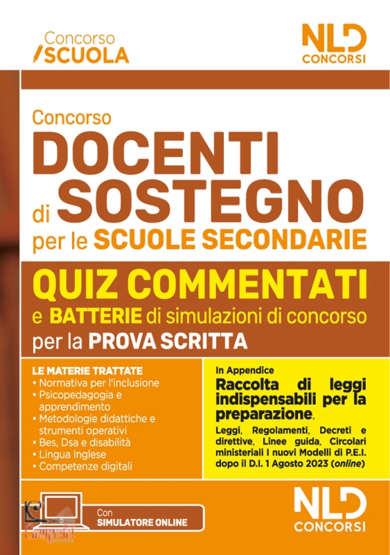Concorso docenti di sostegno per le scuole secondarie. Quiz commentati di verifica per tutte le prove aggiornato al D.I. 1 agosto 2023, n. 153 - in appendice Raccolta di Leggi Indispensabili per la preparazione Editore: Nld Concorsi Data di pubblicazione: 23/10/2023 Numero pagine: 516 Il D.P.C.M. del 3 agosto 2023 ha autorizzato il Ministero dell'Istruzione e del merito ad avviare una procedura concorsuale per l'assunzione di migliaia di nuovi insegnanti di Sostegno. NLD concorsi h a predisposto il Manuale Docenti di Sostegno con Teoria e Test di verifica, pensato per venire incontro alle specifiche esigenze di chi deve prepararsi ad affrontare la prova scritta del concorso. Il Manuale si caratterizza per una trattazione completa, aggiornata e, al contempo, schematica e fluida delle materie di concorso: normativa sull'inclusione psicopedagogia e apprendimento metodologie didattiche e strumenti didattici per l'inclusione integrazione e inclusione: Bes, Dsa e disabilità valutazione degli apprendimenti lingua inglese(on line); competenze digitali(online). Sono state messe particolarmente a fuoco, tra le tante, le parti relative a: evoluzione normativa in materia di inclusione; organi coinvolti nel processo di inclusione; accertamento delle disabilità (Linee Guida del 2022); Metodologia di progettazione del PEI (fino al D.I. 1 agosto 2023, n. 153); compiti del docente di sostegno; quadri diagnostici; storia della pedagogia; psicopedagogia; strumenti didattici digitali per l'inclusione; Tic e scuola; inclusione e integrazione; integrazione multiculturale. Per ciascuna materia trattata sono inoltre inserite batterie di quiz, utili a saggiare la preparazione. Completa il manuale una Appendice "I documenti indispensabili per la preparazione", con Leggi, Regolamenti, Decreti e direttive, Linee guida, Circolari ministeriali su cui potranno vertere le prove concorsuali. Il Manuale consente l'accesso ad un'estensione online, consultabile con apposita password, per rimanere aggiornati sulle materie oggetto d'esame. Per mettere a fuoco le tecniche di soluzione dei quiz, oltre che per simulare la prova di concorso, si consiglia il Volume Docenti di sostegno. Quiz commentati e Batterie di simulazioni di concorso per la prova scritta. Libreria Campedèl Belluno Acquista | |