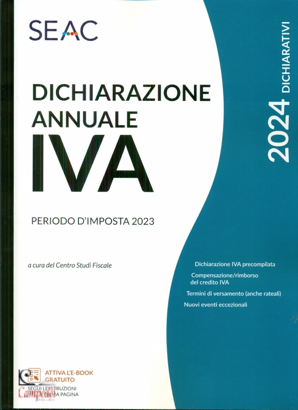 DICHIARAZIONE ANNUALE IVA 2024 A cura di: Centro Studi Fiscale Seac Pubblicato da SEAC Data Gennaio 2024 Dichiarazione IVA precompilata Compensazione/rimborso del credito IVA Termini di versamento (anche rateali) Eventi eccezionali Il testo si propone come guida alla compilazione della dichiarazione annuale IVA e di importanti adempimenti quali la comunicazione delle liquidazioni periodiche e la comunicazione dei dati delle operazioni con l’estero. La dichiarazione annuale IVA 2024 è analizzata commentando rigo per rigo il modello e ad integrazione sono proposti molti esempi pratici di compilazione: in particolare, i singoli quadri sono analizzati evidenziando le novità intervenute rispetto al dichiarativo del precedente anno. Nell’analisi si tiene conto delle regole IVA in materia di fatturazione e corrispettivi telematici, considerata l’introduzione di tali obblighi in modo generalizzato. La specifica sezione dedicata alla comunicazione delle liquidazioni periodiche IVA affronta approfonditamente l’adempimento con un’analisi dettagliata dei dati che devono essere forniti all’Amministrazione finanziaria, tenendo conto dell’apposito modello pubblicato dall’Agenzia delle Entrate. Sono riportati ed illustrati anche i numerosi chiarimenti forniti dall’Amministrazione finanziaria con documenti di prassi e con le numerose FAQ, relativamente ai dati da indicare ed alla modalità di composizione e trasmissione del file .xml. Infine, viene illustrata l a comunicazione dei dati delle operazioni effettuate e ricevute con soggetti non stabiliti nel territorio dello Stato. Un’appendice è dedicata alla dichiarazione IVA precompilata. Si tenga inoltre conto che i tre adempimenti sono oggetto di controlli sempre più puntuali e stringenti da parte dell’Amministrazione finanziaria, che è in grado di incrociare i dati con quelli ricevuti tramite le fatture elettroniche ed i corrispettivi telematici. | |