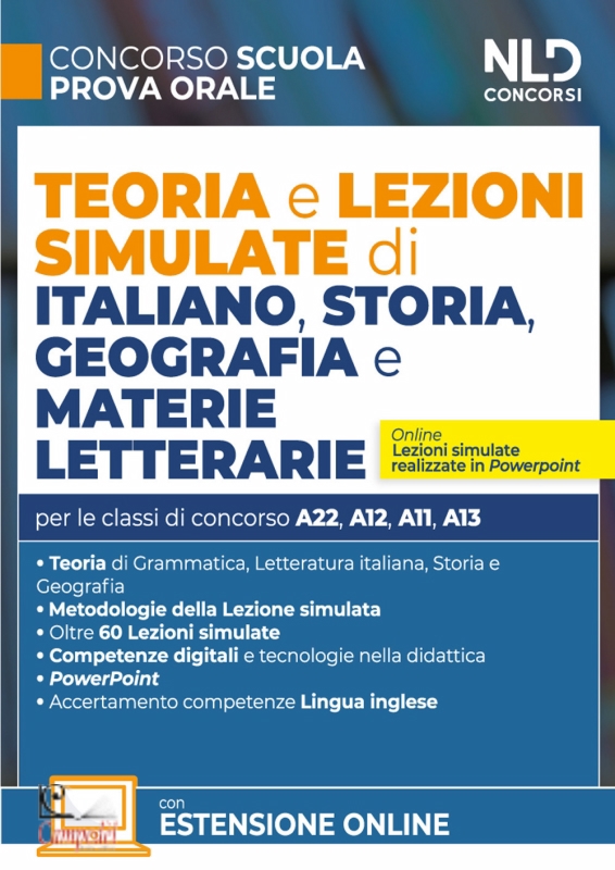 Concorso Scuola. Teoria e lezioni simulate di italiano, storia, geografia e materie letterarie. Classi di concorso A11, A12, A13, A22. Con espansioni online Editore: Nld Concorsi Collana: Concorso scuola prova orale Edizione: 3 Data di Pubblicazione:22 marzo 2024 Il volume Teoria e Lezioni simulate di Italiano, Storia e Geografia e Materie Letterarie, Nld concorsi, è stato predisposto per assicurare una preparazione completa alla prova orale del Concorso scuola, Classi A1 1, A12, A13, A22. Abbina, infatti, alla trattazione teorica delle materie un focus sulle metodologie e strategie di organizzazione della lezione simulata, nonchè oltre 60 Lezioni simulate svolte sulle singole materie delle classi. Per garantire la possibilità di prepararsi senza disperdersi tra numerosi manuali, il volume, oltre a fornire Teoria, Tecniche di organizzazione delle Lezioni e numerosi esempi di Lezioni simulate, fornisce le basi per affrontare la prova di Inglese, nonché una descrizione delle competenze digitali necessarie, con un focus sulle modalità di uso del Powerpoint, utile nella predisposizione della prova orale. Per integrare e approfondire la preparazione alla prova orale si consigliano: - Manuale concorso scuola straordinario ter; - Legislazione e normativa Scolastica per il Concorso Scuola; - Competenze Digitali e tecnologie nella didattica per il Concorso Scuola. Libreria Campedèl Belluno Acquista | |