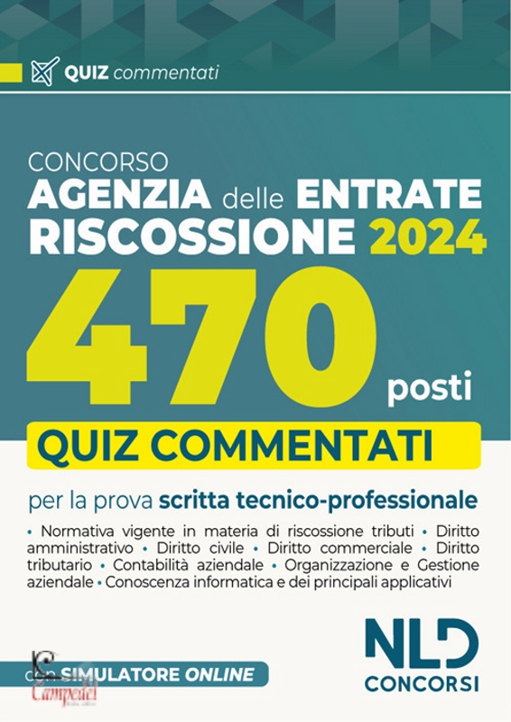 Concorso 470 Agenti di riscossione. Agenzia delle Entrate. Quiz commentati capitolo per capitolo. Con software di simulazione Editore: Nld Concorsi Data di pubblicazione: 20/06/2024 Numero pagine: 471 L' Agenzia delle Entrate - Riscossione ha bandito l'avviso di selezione per l'assunzione a tempo indeterminato di 470 Addetti Riscossione. Il manuale 470 Agenzia delle Entrate Riscossione viene incontro alle specifiche esigenze di chi deve prepararsi ad affrontare la prova scritta tecnica- professionale. Il manuale si caratterizza per una trattazione completa, aggiornata e, al contempo, schematica e fluida delle seguenti materie: normativa vigente in materia di riscossione tributi; diritto tributario; diritto amministrativo; diritto civile; diritto commerciale; contabilità aziendale; organizzazione e gestione aziendale; conoscenza informatica e dei principali applicativi. Il volume è aggiornato alle più importanti novità legislative, tra cui: Decreto Riscossione Tributaria (approvato in via definitiva il 22 luglio 2024); D.Lgs 14 giugno 2024, n. 87 (Sanzioni Tributarie); L. 26 giugno 2024, n. 86 (Autonomia differenziata delle Regioni). Per consentire di affiancare allo studio teorico una immediata verifica della acquisita capacità di risolvere i corrispondenti test, il Manuale presenta quiz di verifica suddivisi per ciascuna Parte o per singoli Capitoli. Il Manuale permette, infine, l'accesso ad un'estensione online, consultabile con apposita password, per rimanere aggiornati sulle materie oggetto d'esame. Libreria Campedèl Belluno Acquista | |
