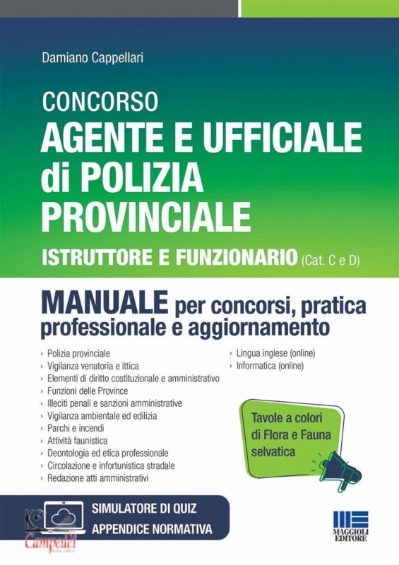 Cappellari Damiano Concorso Agente e Ufficiale di Polizia Provinciale. Istruttore e Funzionario (Cat C e D). Manuale per concorsi, pratica professionale e aggiornamento. Con Tavole a colori di fauna e flora selvatica. Con software di simulazione Editore: Maggioli Editore Data di pubblicazione: 31/07/2024 Numero pagine: 936 Collana: Concorsi&Esami Questo manuale è un ottimo strumento per la preparazione alle prove dei concorsi per Agente e Ufficiale di Polizia provinciale. Il testo è stato realizzato e curato da un autore con esperienza pluriennale nella Polizia provinciale. L'intento è proporre al candidato il livello migliore possibile di conoscenza di ogni singola materia trattata nell'ottica del superamento delle prove del concorso, ma anche proporre un aggiornamento professionale per chi ricopre già quel ruolo, con un approccio più pratico. Il testo è suddiviso nelle seguenti Parti: Polizia provinciale; Protezione della fauna selvatica omeoterma; Vigilanza venatoria; Appunti in materia di armi; Vigilanza ittica; Elementi di diritto costituzionale e amministrativo (L. 689/1981); Funzioni delle Province; Illeciti penali e sanzioni amministrative; Vigilanza ambientale ed edilizia; Circolazione e infortunistica stradale; Legge sui parchi; Funghi epigei; Funghi ipogei; Incendi boschivi; Maltrattamento di animali; Flora e fauna inferiore; Guardie volontarie ittico-venatorie; Gestione faunistica; Fauna in difficoltà; Deontologia ed etica professionale. Il volume contiene, inoltre, 78 mappe concettuali-operative, 14 sanzionari, una selezione di quiz e 80 modelli per la redazione degli atti, utili per esercitarsi in vista delle prove concorsuali, nonché 73 sentenze della Cassazione Penale e Civile e del Consiglio di Stato. Nella sezione online collegata al libro sono disponibili: simulatore di quiz, teoria e quiz di inglese e informatica, appendice legislativa. Libreria Campedèl Belluno Acquista | |