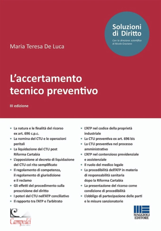 De Luca Maria Teresa L'accertamento tecnico preventivo Editore: Maggioli Editore Data di pubblicazione: 07/08/2024 Numero pagine: 216 Collana: Soluzioni di diritto Il presente lavoro, giunto alla sua III edizione, è aggiornato alle novità introdotte dalla Riforma Cartabia e alla giurisprudenza più recente e conferma la sua impostazione molto apprezzata nelle edizioni precedenti: contiene istruzioni pratiche per la richiesta dell'accertamento tecnico preventivo, istituto che persegue lo scopo di impedire l'inevitabile dispersione degli elementi probatori, in quanto il decorso del tempo produce modificazioni sia ai luoghi che alle persone; nonché per la richiesta di consulenza tecnica preventiva ai fini della composizione della lite, prevista dall'art. 696 bis c.p.c. Questo strumento, insieme all'esigenza di preservare gli elementi probatori, favorisce l'interesse alla conciliazione delle parti nella fase antecedente all'instaurazione del giudizio di merito. Attraverso itinerari giurisprudenziali, riferimenti normativi e formule, si risponde alle principali questioni legate all'applicazione dell'istituto dell'ATP e si risolvono, tra gli altri, quesiti in cui se ne valuta l'applicabilità al diritto industriale, al diritto amministrativo, al diritto previdenziale e al campo della responsabilità medica, la cui applicazione ha subìto importanti cambiamenti a seguito dell'entrata in vigore della Riforma Cartabia. Libreria Campedèl Belluno Acquista | |