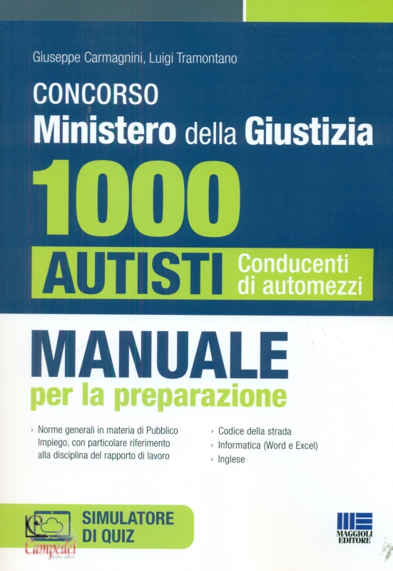 Concorso Ministero della Giustizia. 1000 autisti conducenti di automezzi. Manuale per la preparazione. Con software di simulazione Di: Giuseppe Carmagnini Luigi Tramontano – Giuseppe Carbagnini Editore: Maggioli Editore Collana: Concorsi&Esami Data di Pubblicazione: 27 agosto 2024 Il Manuale si presenta come un ottimo strumento per la preparazione alla prova scritta del concorso indetto dal Ministero della Giustizia per 1000 Autisti. La prova scritta consisterà in un test di n. 30 quesiti a risposta multipla da risolvere in 45 minuti, volti a verificare le conoscenze afferenti alle seguenti materie: norme generali in materia di pubblico impiego, con particolare riferimento alla disciplina del rapporto di lavoro (Titolo IV del D.lgs. n. 165 del 30 marzo 2001) (8 quesiti); codice della strada (Titolo I - artt. 1-12; Titolo II, con riguardo alla segnaletica stradale; Titolo IV - artt. da 115 a 130; Titolo V; Titolo VI - artt. da 200 a 201 (14 quesiti); conoscenza base delle funzioni Word ed Excel (4 quesiti); conoscenza della lingua inglese di livello A2 (4 quesiti). Il volume contiene la trattazione teorica completa delle materie utili per la preparazione alla prova, ovvero: Norme generali sul Pubblico Impiego; Codice della strada; Informatica (Word e Excel); Inglese. Nella sezione online collegata al libro è disponibile un simulatore di quiz per esercitarsi in vista della prova. Libreria Campedèl Belluno Acquista | |