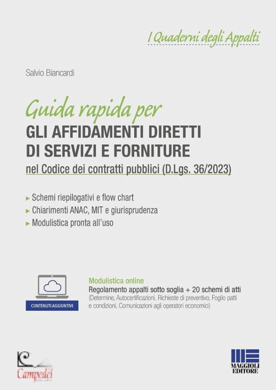 Guida rapida per gli affidamenti diretti di servizi e forniture nel Codice dei contratti pubblici (D.Lgs. 36/2023). Con espansione online di: Biancardi Salvio Editore: Maggioli Editore Collana: I quaderni degli appalti L'affidamento diretto è una procedura di scelta del contraente in cui il contratto è aggiudicato a un singolo operatore economico senza lo svolgimento di una fase competitiva. Tale tipo di procedura rappresenta, perciò, una modalità di aggiudicazione eccezionale in quanto sottratta alle dinamiche del mercato e della concorrenza. Pertanto, come precisato anche nelle definizioni presenti nel Codice dei contratti pubblici, l'affidamento diretto non costituisce una procedura di gara. Purtuttavia, anche se strumento di grande flessibilità, l'affidamento diretto costituisce comunque un appalto, ed è, quindi, necessario rispettare precise regole al fine di evitare di incorrere in illegittimità. A distanza di poco più di un anno dall'efficacia del nuovo Codice , il presente quaderno si pone l'obiettivo di raccogliere e illustrare le pronunce e i chiarimenti forniti sul tema, fornendo precise indicazioni ai RUP al fine di rispettare la normativa dettata in materia, mediante l'esame delle disposizioni del Codice, dei pareri dell'ANAC e del Ministero delle Infrastrutture, delle pronunce della giurisprudenza, nonché delle interpretazioni fornite dalla dottrina. A tal fine, il quaderno è corredato da parti descrittive, da una flow chart riepilogativa della procedura che richiama, passo passo, i singoli atti da utilizzare, da schemi riepilogativi e da tutta la modulistica necessaria per addivenire rapidamente all'affidamento della fornitura o del servizio. In particolare, per quanto riguarda la modulistica, sono forniti numerosi modelli pronti all'uso, tra i quali: il Regolamento degli appalti sotto soglia; le determine per gli affidamenti diretti d valore superiore a 40.000 euro, sotto i 40.000 euro e sotto i 5.000 euro, per gli affidamenti diretti mediante ODA sul Mercato elettronico, mediante trattativa diretta sul Mercato elettronico e a favore dell'operatore economico uscente; facsimili di richieste di preventivo, autocertificazioni dei requisiti, foglio patti e condizioni e comunicazioni agli operatori economici dell'esito della procedura. Libreria Campedèl Belluno Acquista | |