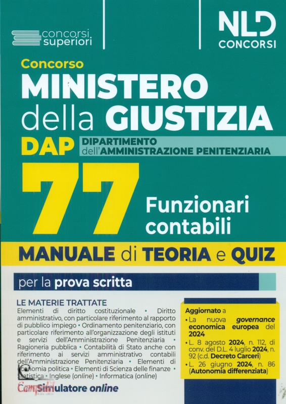 Concorso Ministero della Giustizia 77 Funzionari contabili DAP. Manuale di Teoria e Quiz Con espansione online Editore: Nld Concorsi Collana Concorsi Superiori n. COS 7/3 Data di Pubblicazione: 30.10. 2024 La selezione è affidata ad un'unica prova scritta, consistente nella somministrazione di quesiti a risposta multipla. Le materie trattate - Elementi di diritto costituzionale - Diritto amministrativo - Ordinamento penitenziario - Ragioneria pubblica - Elementi di economia politica - - Elementi di scienza delle finanze - Statistica - Informatica Il Manuale si caratterizza per una trattazione completa, aggiornata e, al contempo, schematica e fluida delle materie del bando: - Ordinamento penitenziario, con particolare riferimento organizzazione degli istituti e ai servizi dell'Amministrazione Penitenziaria; - Ragioneria pubblica; - Contabilità di Stato, anche con riferimento ai servizi amministrativo contabili dell'Amministrazione Penitenziaria; - Elementi di Economia politica - Elementi di Scienza delle finanze; - Elementi di Statistica; - Elementi di Diritto Costituzionale; - Elementi di Diritto Amministrativo, con particolare riferimento al rapporto di pubblico impiego; - Inglese (online); - Informatica (online). Per consentire di affiancare allo studio teorico un’immediata verifica della acquisita capacità di risolvere i corrispondenti test, il Manuale presenta quiz di verifica suddivisi per ciascuna Parte o per i singoli Capitoli che compongono le indicate materie. Il Volume è aggiornato alla L. 8 agosto 2024, n. 112, di conv. del D.L. 4 luglio 2024, n. 92 (c.d. Decreto carceri) e alla L. 26 giugno 2024 n. 86 (c.d. Autonomia differenziata). Attesa l'importanza dell'aspetto esaminato, si è inoltre tenuto conto della recente e innovativa sentenza resa da Cass., Sez. lav., 5 gennaio 2024, n. 396, in tema di scarcerazione dei detenuti che prestano lavoro intra-murario e diritto alla indennità di disoccupazione. Il Manuale permette, infine, l'accesso ad un'estensione online, per rimanere aggiornati sulle materie oggetto d'esame Libreria Campedèl Belluno Acquista | |
