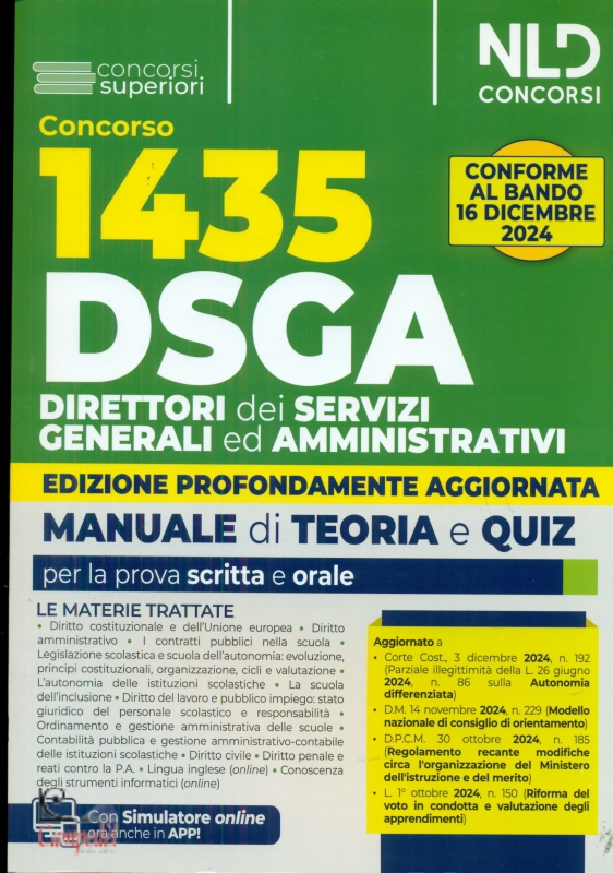 Concorso DSGA 1435 Direttori dei servizi generali ed amministrativi Manuale di teoria e quiz per la prova scritta e orale Edito da: Nel Diritto Collana: Concorsi superiori Il Manuale si caratterizza per una trattazione completa, aggiornata e, al contempo, schematica e fluida delle seguenti materie: Diritto costituzionale e dell’Unione Europea; Diritto amministrativo; I contratti pubblici nella scuola; Legislazione scolastica e scuola dell’autonomia: evoluzione, principi costituzionali, organizzazione, cicli e valutazione; L’autonomia delle istituzioni scolastiche; La scuola dell’inclusione; Diritto del lavoro e pubblico impiego: stato giuridico del personale scolastico e responsabilitą; Ordinamento e gestione amministrativa delle istituzioni scolastiche; Contabilitą pubblica e gestione amministrativo-contabile delle istituzioni scolastiche; Diritto civile; Diritto penale e reati contro la P.A; Lingua inglese (online); Conoscenza degli strumenti informatici (online). Per completare la preparazione si consiglia il volume Quiz Commentati 1435 DSGA, NLD Concorsi, 2025. Libreria Campedčl Belluno Acquista | |