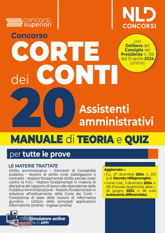 Concorso Corte dei Conti. 20 assistenti amministrativi Manuale con teoria e quiz per tutte le prove. Con simulatore online anche in APP! Pubblicato da: Nel Diritto editore Collana: Concorsi superiori La procedura concorsuale è articolata in una eventuale prova preselettiva, due prove scritte e una orale. Il Manuale Corte dei Conti 20 Assistenti amministrativi, Teoria e quiz, NLD Concorsi, viene incontro alle specifiche esigenze di chi deve prepararsi ad affrontare le prove concorsuali. Le MATERIE TRATTATE - Diritto amministrativo; - Elementi di Contabilità pubblica; - Nozioni di diritto civile (obbligazioni e contratti); - Nozioni fondamentali diritto penale (reati contro la P.A.); - Nozioni fondamentali in materia di disciplina del rapporto di lavoro alle dipendenze della Pubblica Amministrazione; - Nozioni fondamentali in relazione all’ordinamento della Corte dei Conti; - Conoscenza di base delle nozioni di informatica giuridica; - Utilizzo delle principali applicazioni informatiche (online): - Conoscenza della lingua inglese (online). Il Manuale presenta quiz di verifica suddivisi per ciascuna Parte o per singoli Capitoli che compongono le indicate materie. Il Manuale permette, infine, l'accesso ad un'estensione online, consultabile con apposita password, per rimanere aggiornati sulle materie oggetto d'esame. Libreria Campedèl Belluno Acquista | |