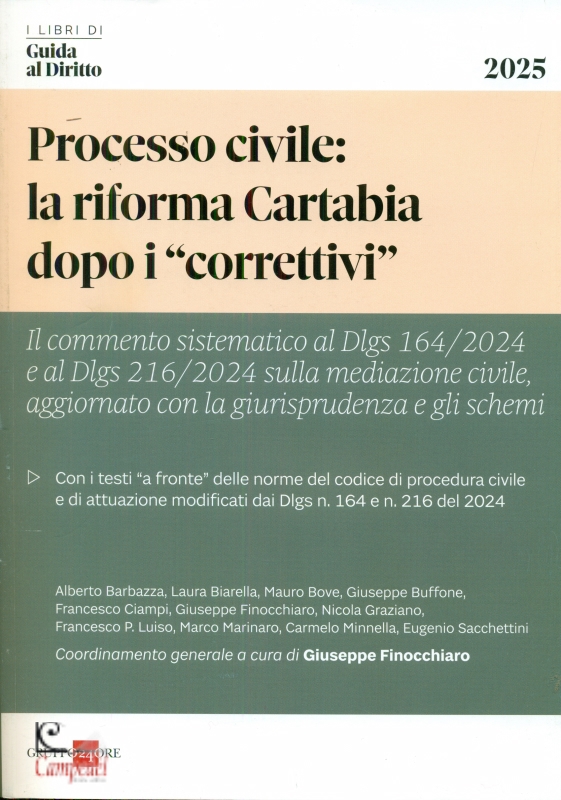 Giuseppe Finocchiaro Processo civile: riforma Cartabia dopo i "correttivi" Pubblicato da: Gruppo 24 Ore Collana: I libri di guida al diritto Il volume offre un’esposizione ordinata e completa di tutte le novitą normative intervenute sul processo civile successivamente alla c.d. riforma Cartabia (Dlgs 149/2022): - non soltanto del Dlgs 31 ottobre 2024, n. 164, noto come correttivo della riforma Cartabia al processo civile, che, apportando modifiche al Cc, al Cpc, alle relative disposizioni di attuazione e ad alcune leggi speciali, incide sulle disposizioni generali del codice di rito, sulla disciplina del processo ordinario di cognizione, gią oggetto di importanti indicazioni ad opera della pronuncia interpretativa di rigetto della Corte costituzionale 3 giugno 2024, n. 96, sul PCT, sulle procedimento semplificato, sulle impugnazioni, sul processo in materia di persone, minorenni e famiglie, sull’esecuzione forzata; - ed infine, del Dlgs 27 dicembre 2024, n. 216, correttivo della mediazione e della negoziazione assistita. Libreria Campedčl Belluno Acquista | |