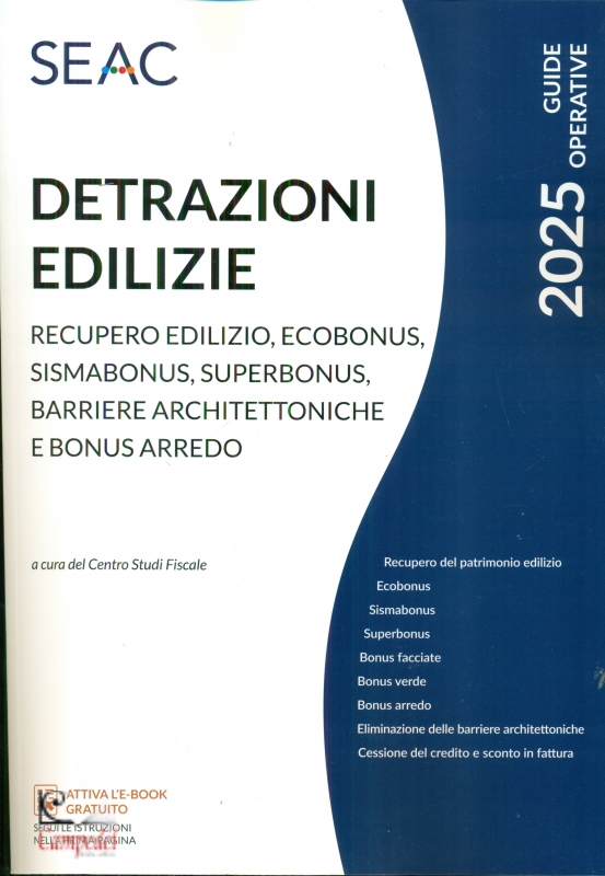 Detrazioni Edilizie 2025: La Guida Definitiva per Commercialisti – Novitą Legge di Bilancio Pubblicato da SEAC A cura di: Centro studi Fiscale SEAC Collana: Guide operative Questa guida completa e aggiornata č il tuo strumento indispensabile per navigare nel complesso mondo delle detrazioni edilizie, con un focus sulle novitą introdotte dalla Legge di Bilancio 2025. Cosa troverai in questa guida: • Panoramica completa delle detrazioni: Recupero del patrimonio edilizio, Ecobonus, Sismabonus, Superbonus, Bonus Facciate, Bonus Verde, Bonus Arredo, Eliminazione delle barriere architettoniche: analizzeremo ogni detrazione nel dettaglio, con un focus sulle percentuali aggiornate al 2025 e sulle diverse tipologie di interventi ammessi. • Novitą Legge di Bilancio 2025: Approfondimento sulle modifiche introdotte dalla Legge n. 207/2024, con particolare attenzione alle nuove percentuali di detrazione, differenziate in base al beneficiario e all'utilizzo dell'immobile. • Cessione del credito e sconto in fattura: Analisi dettagliata delle regole e delle limitazioni previste per la cessione del credito e lo sconto in fattura, con un focus sugli aspetti d'interesse per fornitori e cessionari. • Documenti interpretativi dell'Agenzia delle Entrate: Ampio spazio dedicato all'analisi dei documenti di prassi e delle risposte ai quesiti dell'Agenzia delle Entrate, per una corretta interpretazione delle norme. • Guida pratica all'utilizzo: Per ogni agevolazione, troverai: • Aspetti generali: soggetti, immobili e interventi interessati. • Iter da seguire: istruzioni passo-passo per fruire del beneficio in dichiarazione dei redditi. • Regole di calcolo e attribuzione: esempi pratici e tabelle per una corretta quantificazione della detrazione. • Supporto pratico: Tabelle riassuntive, schemi e facsimili di documentazione per semplificare la comprensione e l'applicazione dei concetti. Libreria Campedčl Belluno Acquista | |