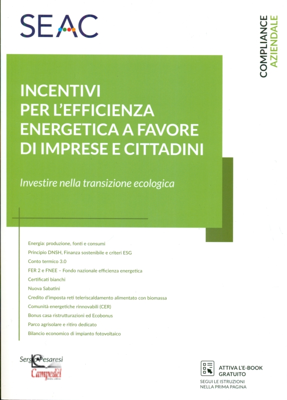 Il volume "Incentivi per l'efficienza energetica a favore di imprese e cittadini" di Seac Editore è lo strumento bussola per orientarsi nel nuovo paradigma dell'economia sostenibile. In linea con il Green Deal europeo e l’Agenda ONU 2030, il testo analizza come l'efficienza energetica e la neutralità carbonica non siano più solo obiettivi ambientali, ma leve fondamentali per generare valore, innovazione e profitto. Visione Strategica e Risposte Globali Il manuale parte da un inquadramento dei costi ambientali e sociali dell'energia per arrivare alle soluzioni concrete richieste dal mercato globale: • Obiettivi 2050: Comprendere le politiche internazionali per la neutralità climatica. • Standard ESG e Finanza Sostenibile: Come integrare i criteri Environmental, Social e Governance per migliorare il posizionamento sul mercato e l'accesso al credito. • Principio DNSH: Guida al rispetto del vincolo "Do No Significant Harm" (non arrecare danno significativo all'ambiente) necessario per accedere ai fondi pubblici. • Autonomia Energetica e Incentivi Nazionali • Il cuore del testo è dedicato agli strumenti operativi per abbattere i costi dell'energia e aumentare l'efficienza di abitazioni e aziende: • Piano Transizione 5.0: Analisi dei crediti d'imposta per la digitalizzazione e il risparmio energetico dei processi produttivi. • Comunità Energetiche Rinnovabili (CER): Guida alla costituzione e ai vantaggi delle configurazioni di autoconsumo collettivo. • Fondi e Agevolazioni: Focus su FTI (Fondo Transizione Industriale), REN (Reddito Energetico Nazionale) e FNEE (Fondo Efficienza Energetica). • Nuovi Regimi FER: Approfondimento su FER X transitorio e FER 2 per la produzione di energia da fonti rinnovabili. • Agricoltura e Residenziale: I Nuovi Bonus • Una trattazione specifica è riservata ai settori chiave per la transizione: • Agro-Energia: Analisi del bando Parco Agrisolare, dell'agrivoltaico e della gestione dello Scambio sul Posto e Ritiro Dedicato. • Riqualificazione Edilizia: Integrazione con l'Ecobonus e i bonus casa per le ristrutturazioni finalizzate all'efficienza. • Certificati Bianchi ed Energy Release 2.0: Strumenti per incentivare il risparmio negli usi finali dell'energia. • Casi Pratici e Bilancio Economico • Il volume non si ferma alla teoria normativa, ma offre supporto operativo tramite: • Analisi di Impianto: Esempi di bilancio economico d i un impianto fotovoltaico, per valutarne l'effettivo ritorno sull'investimento. • Casi Pratici di Successo: Simulazioni di adesione a CER o fruizione di crediti d'imposta per PMI. • Conto Termico 3.0: Guida agli incentivi per la produzione di energia termica da fonti rinnovabili. Libreria Campedèl Belluno Acquista | |